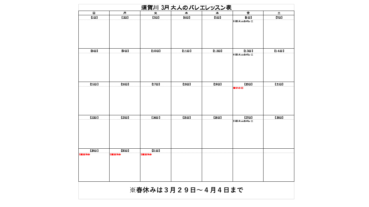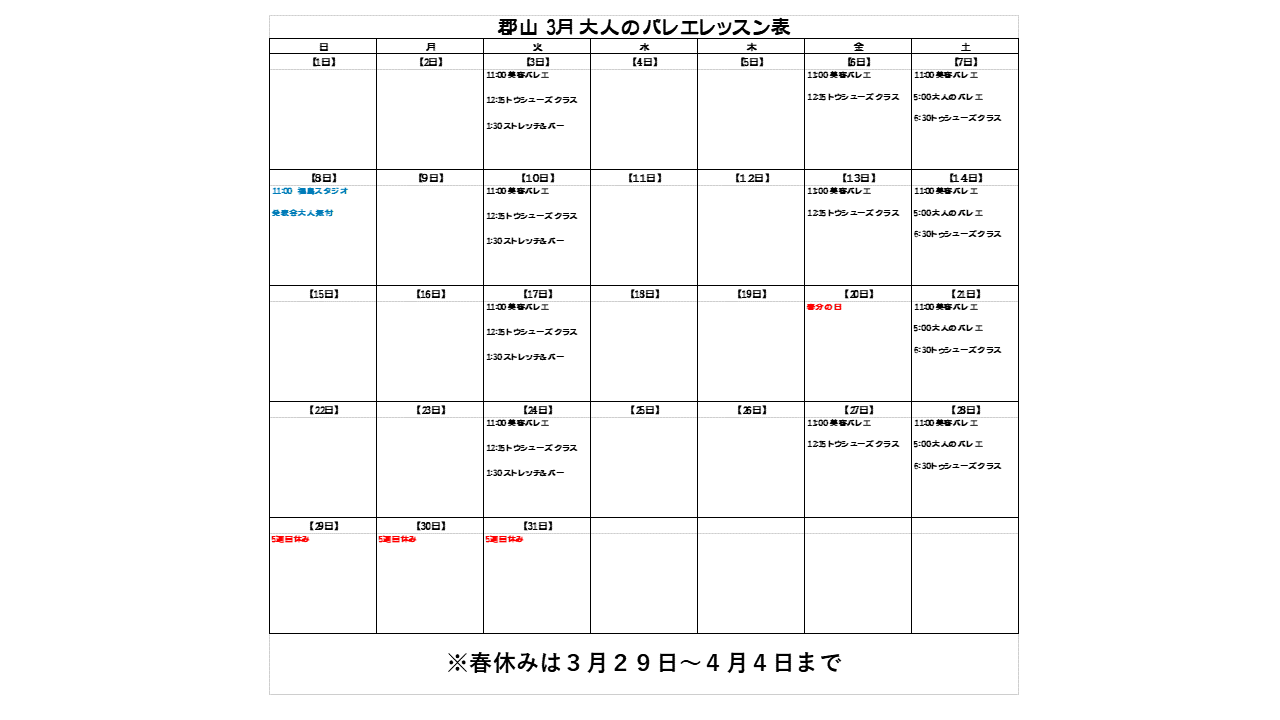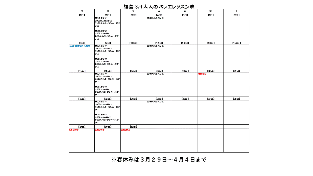 3月大人のレッスン表です。